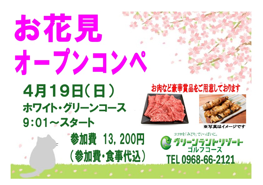 2026年3月17日 / 最終更新日時 : 2026年3月17日 別府正文 4月のオープンコンペのご案内 毎月恒例のオープンコンペ、 4月は『お花見オープンコンペ』 桜は葉桜になっていることでしうが、賞品は満開名豪華賞品を準備いたします。 みなさまのご予約をお待ち申し上げます。