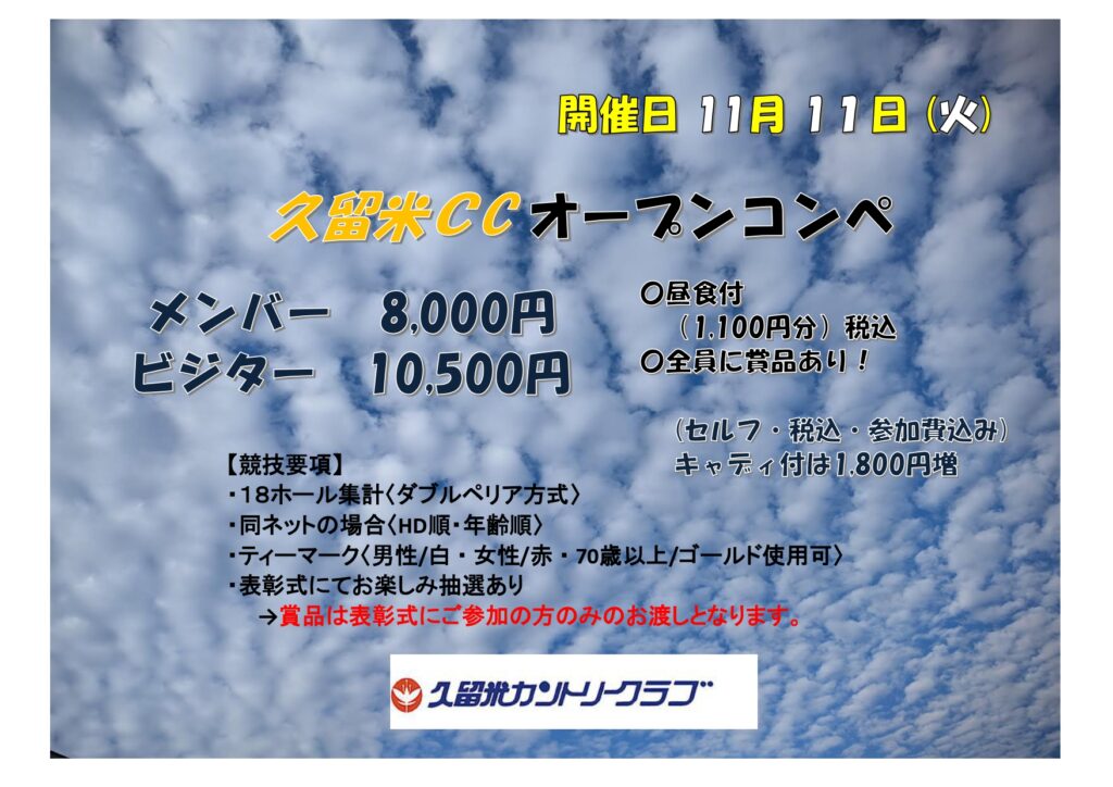 2025年11月1日 / 最終更新日時 : 2025年10月31日 久留米CCスタッフ スタッフブログ すっかり秋めいてまいりました 今日から11月、もう少し秋らしさを楽しみたいと思う 今日この頃でございますが 今月もオープンコンペを開催致します 皆様のご参加、お待ち致しております