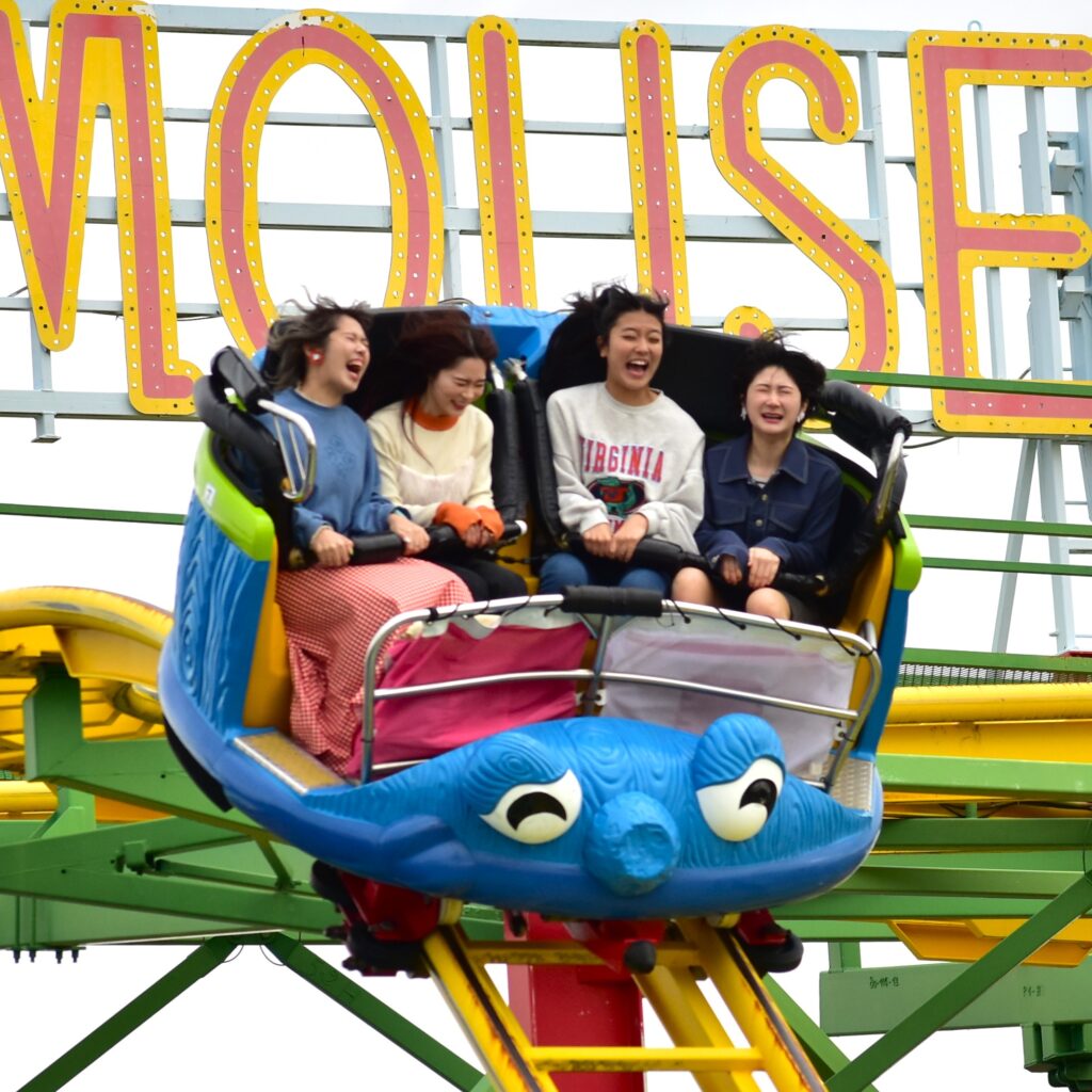 見た目がかわいいからといって、なめてはいけません!細いレールの上を、4人乗りのライドが独自に回転しながら疾走します。正に、コーヒーカップがレールの上をはしるような複合的な恐怖!終わった後、へらへらという変な笑いがでます。名作。